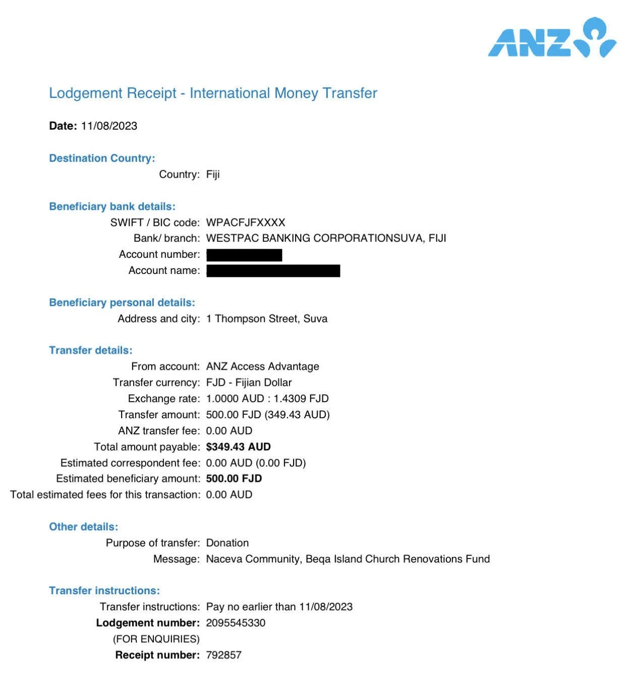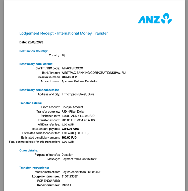 On the 25th August 2023 our colleague Jacqueline Bates contributed 500 FJD ( $359.96 AUD ) to the Naceva Village Development Council account via Aparama for the “Out Of Bounds Project. We also brokered a contribution of 500 FJD ( $354.96 AUD) on the 26th August 2023 for a Contributor who wishes to remain anonymous.